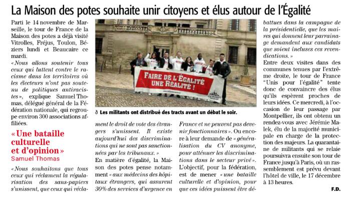 Le Tour de France "unis pour l'égalité" aura lieu du 14 novembre (à Marseille) au 17 décembre (à Douai). Durant 5 semaines les jeunes militants des Maisons des Potes iront à la rencontre de migrants, de travailleurs sans papiers d'habitants des quartiers populaires, de syndicats de travailleurs, d'associations de quartiers, de chefs d'entreprises , d'élus locaux, de préfets, de parlementaires pour mobiliser tous ces acteurs de terrain pour faire triompher nos revendications concrètes qui permettront de Faire de l'Egalité une Réalité.